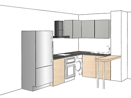 Malgré la petite surface, il s’agit d’aménager la cuisine avec tous les éléments nécessaires pour répondre à l’ensemble des besoins de notre client :