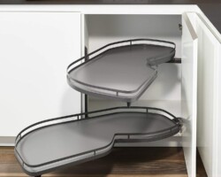 Installer des meubles d’angle haut et bas est la solution la plus courante et la plus pratique pour exploiter tous les espaces disponibles dans une cuisine disposée en L. Et pour accéder facilement à l’ensemble du contenu du placard, le meuble bas est équipé d’un panier à plateaux pivotants avec extraction totale.