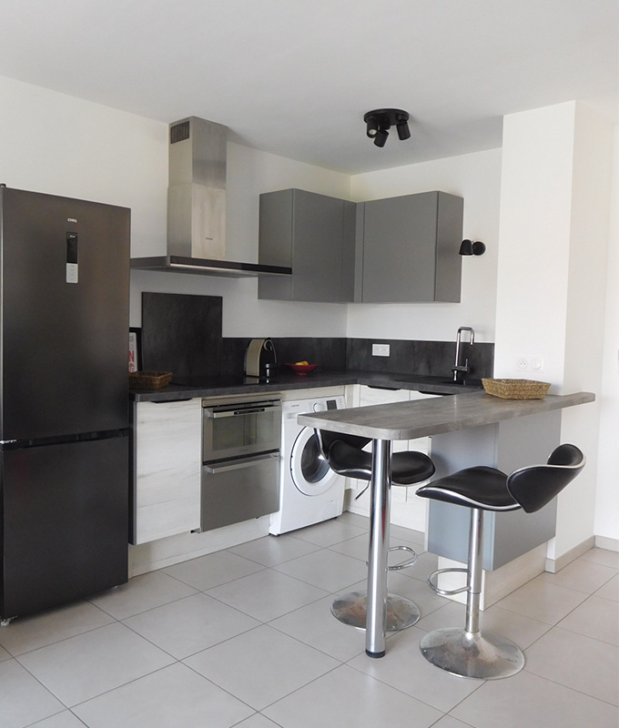 À la suite de l’achat de son appartement dans une résidence neuve, notre client a besoin d’aménager une cuisine ouverte avec coin repas dans la pièce à vivre. L’espace cuisine doit également inclure le lave-linge qui ne peut pas être installé dans la salle de bain faute de place.