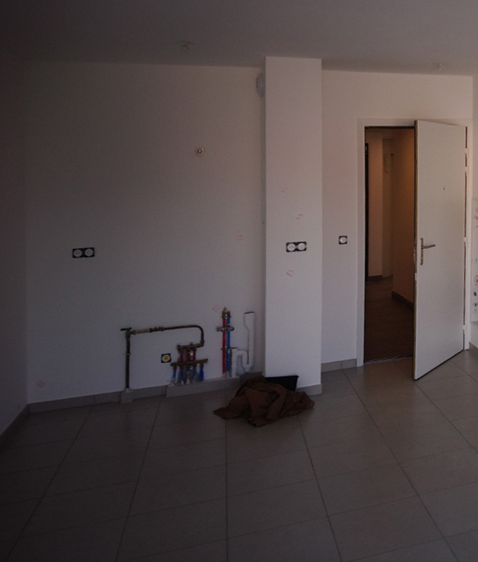 Partir d’une pièce complètement vide est plus simple pour créer et aménager une cuisine. Cependant, il faut aussi prendre en compte l’espace général de la pièce de vie et les contraintes techniques comme les arrivées d’eau et les prises. L’ensemble des éléments techniques – prises électriques, évacuations et arrivées d’eau – sont déjà en place. La disposition de ces éléments détermine l’emplacement des éléments principaux comme l’évier et le four.