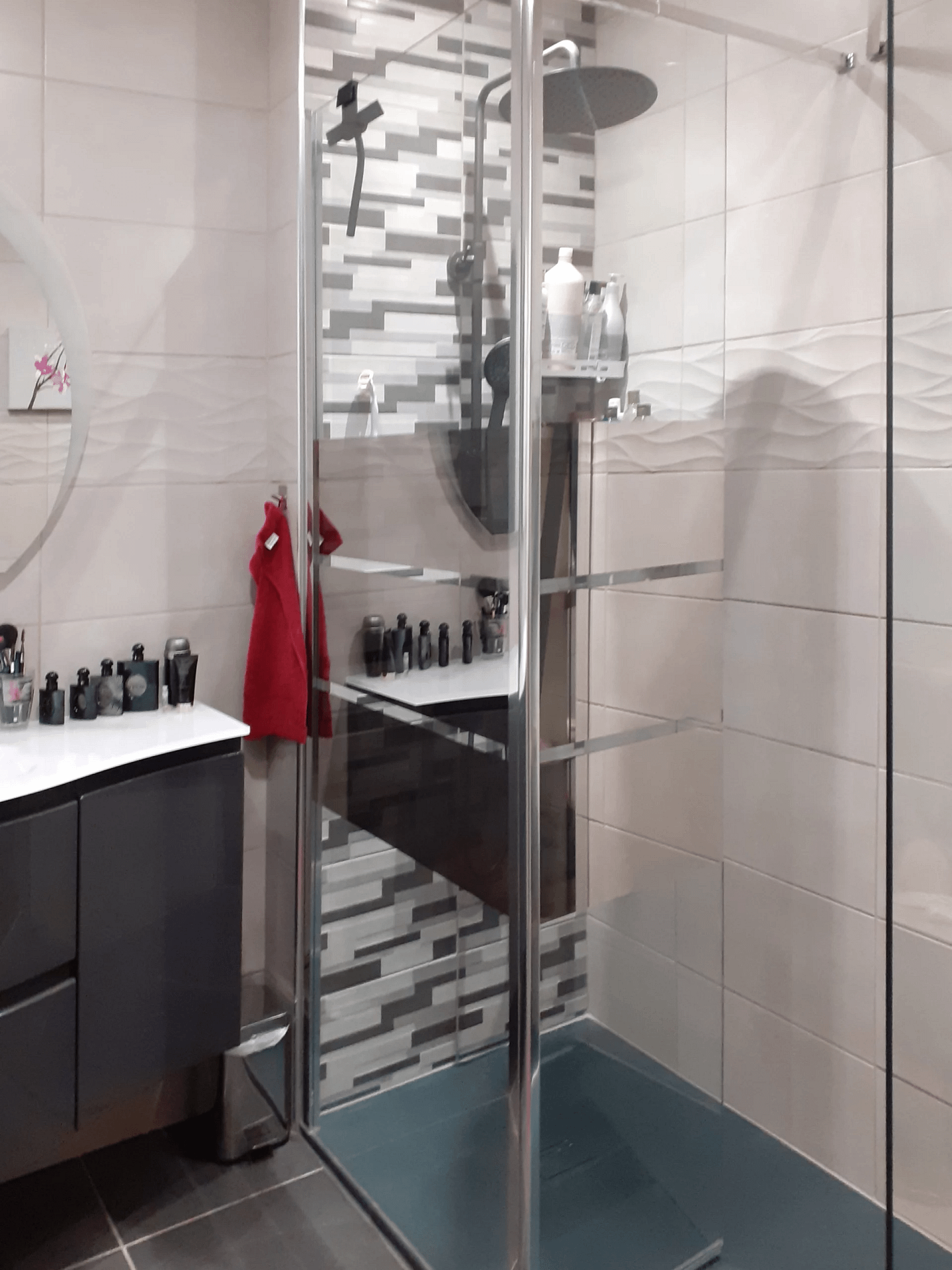 Notre cliente peut désormais finaliser la modernisation de son logement. Son nouveau projet est de rénover sa salle de bain vieillissante et abimée par le temps. Elle en profite pour changer le mobilier avec des éléments plus actuels et design. Elle fait appel à Imaginons Chez Vous pour remplacer la baignoire par une très grande douche et créer un espace chaleureux qui met de bonne humeur le matin.